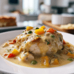 Creamy Chicken a la King is a rich and flavorful dish made with cooked chicken in a creamy sauce that typically includes vegetables like bell peppers and mushrooms. It’s often served over rice or noodles for a comforting meal that is easy to prepare.