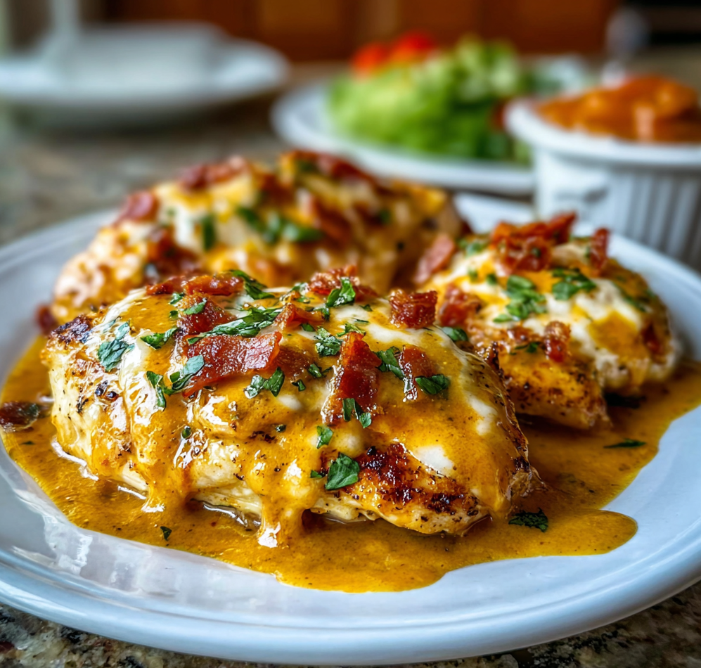Once seared, transfer the chicken to a baking dish. Layer with sautéed mushrooms and crispy bacon. Top with shredded cheddar cheese and a sprinkle of parsley for freshness. Bake in the preheated oven for 25-30 minutes or until the internal temperature reaches 165°F (74°C).