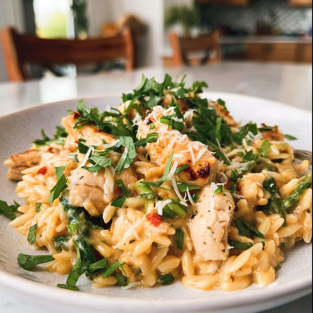 - Slice rested chicken into bite-sized pieces. Combine cooked orzo, sautéed veggies, and sliced chicken in the skillet; stir well.