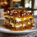 Creamy Pecan Pie Lasagna with Graham Cracker Crust is a no-bake dessert that combines layers of rich cream cheese filling and toasted pecans on a crunchy graham cracker base. The dessert mimics traditional pecan pie flavors but in a lighter format, making it perfect for gatherings or family meals.