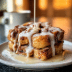 Once cooked, transfer your Delicious Cinnamon Roll French Toast Bites onto a serving platter. In a small bowl, mix powdered sugar with milk or cream until smooth and drizzle it generously over the bites before serving.