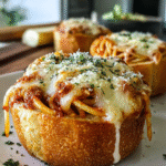 To make the Spaghetti Garlic Bread Bowls Recipe, start by preheating your oven to 375°F (190°C). While the oven heats, prepare the garlic bread bowls. Take your favorite bread rolls and hollow them out gently, ensuring you leave enough bread on the sides for support.