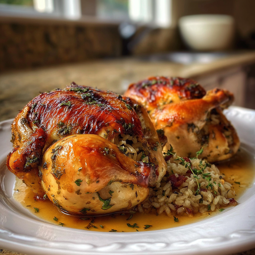 Cornish game hens / dinner ideas / holiday meals / roasted chicken / savory stuffing / special occasions / stuffed recipes